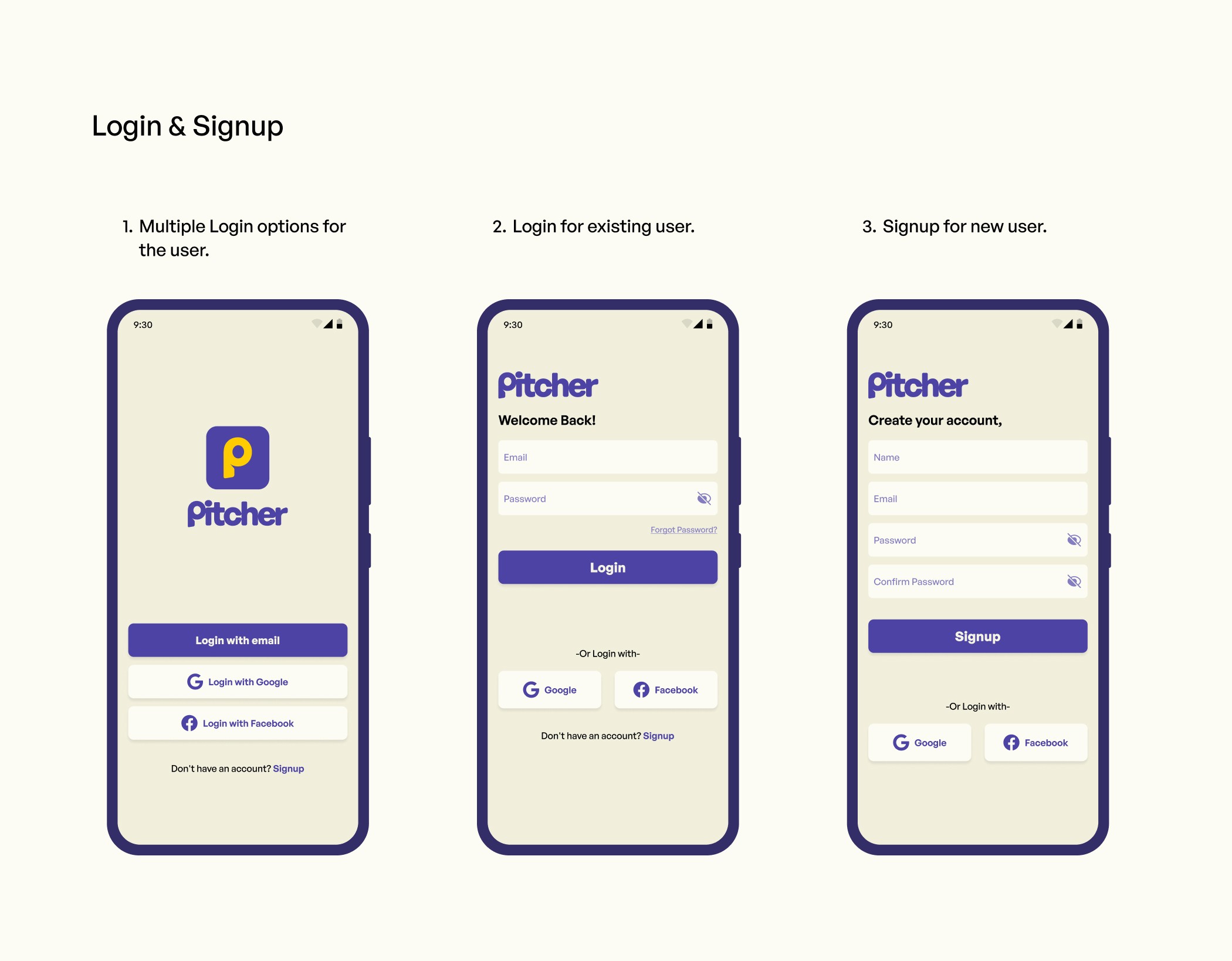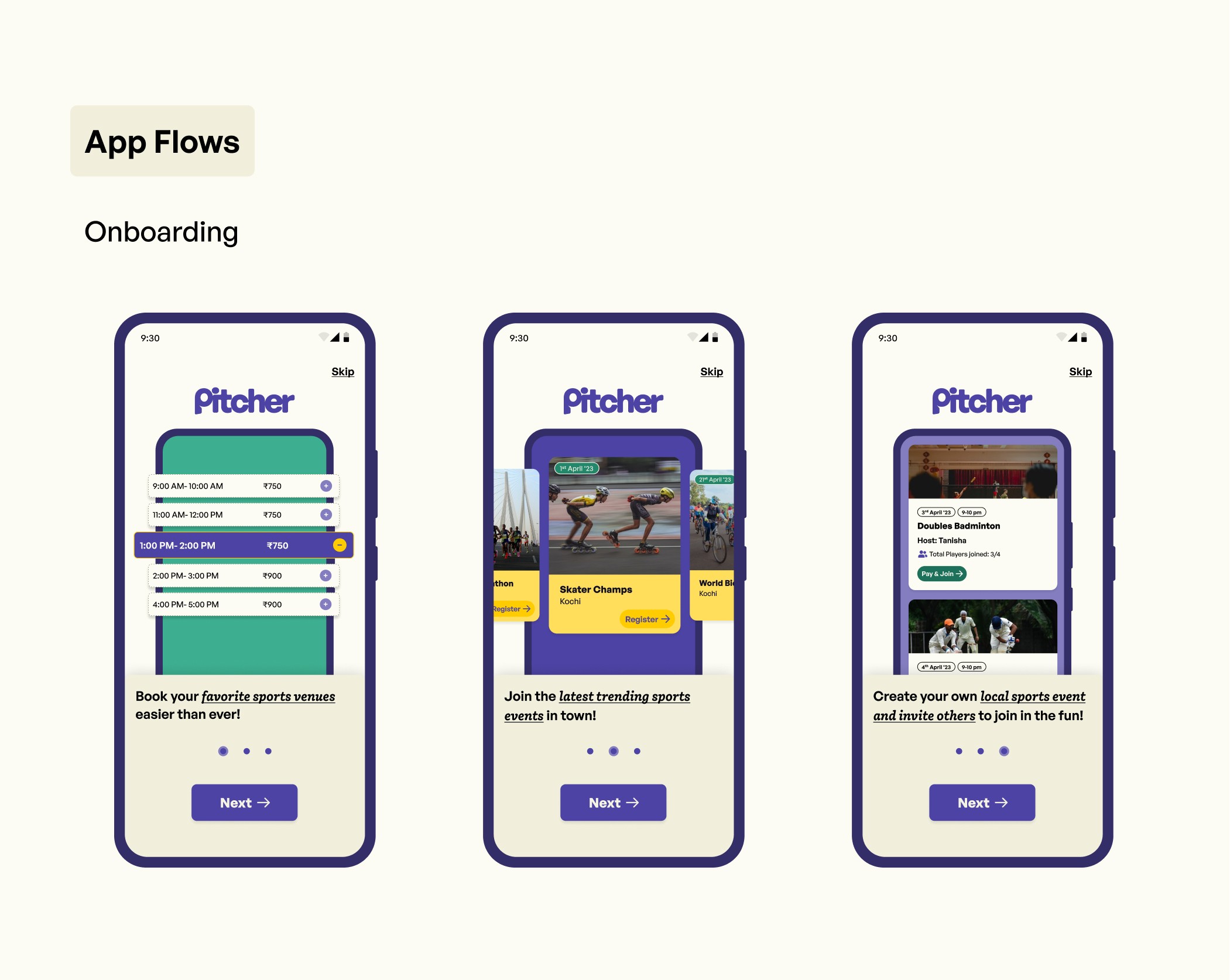 Designing Pitcher as my first complete mobile app project was a transformative experience in moving from visual design to true product thinking. Building an ecosystem from scratch challenged me to map out complex user journeys by balancing the functional needs of venue booking with the social dynamics of finding teammates.